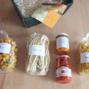 Inhalt*: Nidi Hartweizen bunt, 250 g Pappardelle Natur, 250 g Tomatensoße regionaler Herstellung, 340 g (Bild abweichend) Cantuccine, 200 g